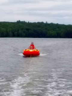| Grandpa bailing out the boat with his coffee mug after a huge downpour! Jared sat on the corner so the water would pool. |